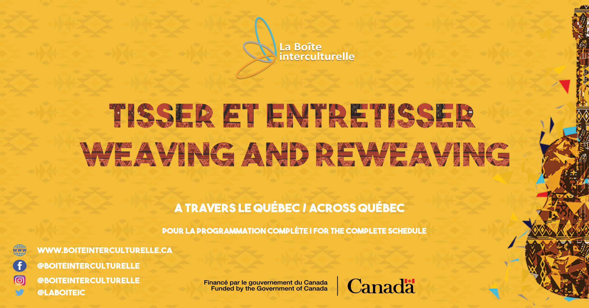 Saint-Adelphe (Québec), le 21 juin 2022 — Grâce au soutien du gouvernement du Canada et en collaboration avec des partenaires à travers la province de Québec, La Boîte interculturelle lancera, dès septembre 2022, un nouveau projet intitulé Tisser et Entretisser, une expérience musicale interactive. La Boîte offrira une série d’événements ayant pour but le rapprochement des cultures avec la musique comme agent facilitateur.